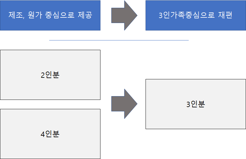 풀무원 생가득 브랜드의 제품도 4인분, 2인분 주로 짝수로 제품을 만들어내고 있었다. 아마도 생산이 쉬워서 또 포장디자인을 바꾸지 않아도 되어서인지 싶다.